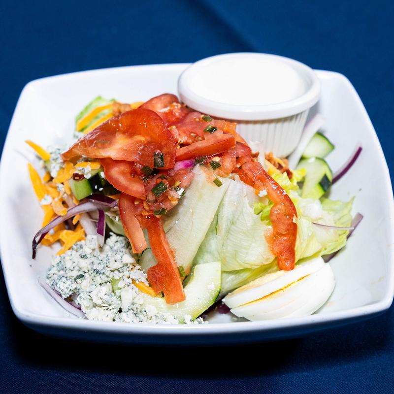 1/2 Wedge $8.95 | 1 Wedge $12.95 • Iceberg lettuce, bleu cheese crumbles, warm bacon, red onion, tomato, shredded cheese, egg, and cucumber.