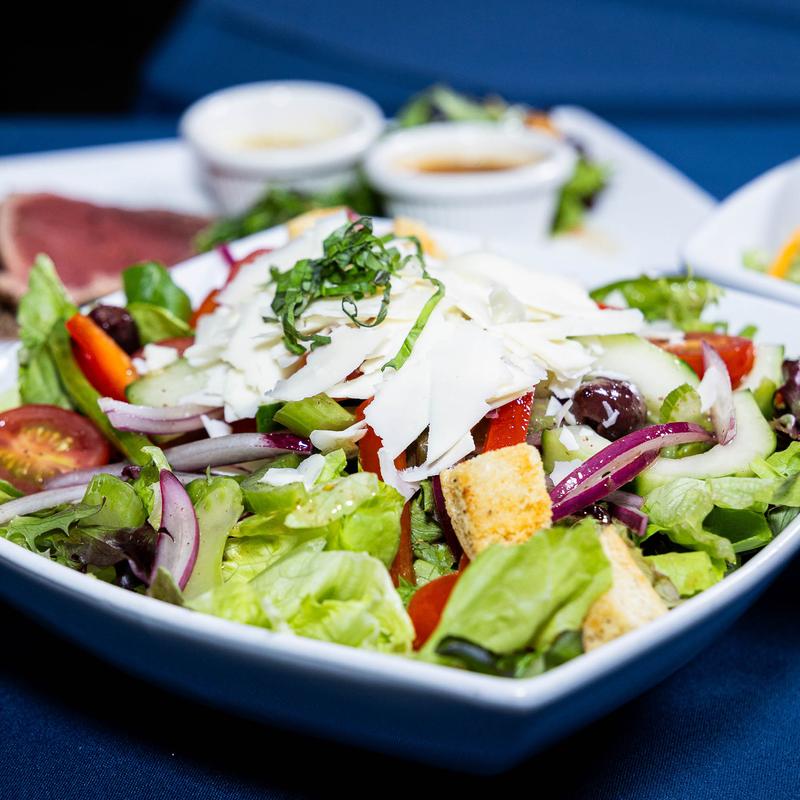Small $6.95 | Large $10.95 • Cucumber, tomato, celery, red onion, olives, peppers, fresh basil, and toast points with red wine vinaigrette.